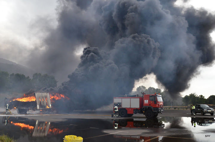 El área de descanso de la A66 a su paso por Cantagallo fue el escenario del espectacular incendio de un camión trailer cargado de bobinas de plástico. Se trata de l combustible ideal para un fuego de larga duración y la proyección de humo tóxico a la atmósfera. Bobinas de cerca de una tonelada (800 kg) de plástico destinado posiblemente a la instalación de invernaderos en Francia. Una docena de ellas que viajaban en el remolque del camión trailer incendiado.